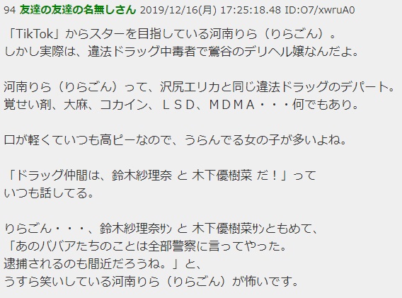 河南りら(りらごん)って、沢尻エリカと同じ違法ドラッグのデパート。