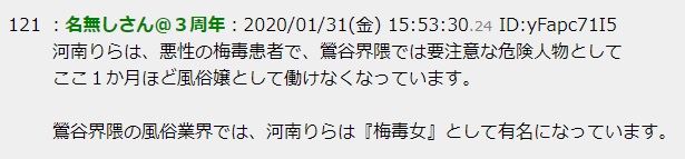 鶯谷界隈の風俗業界では、河南りらは『梅毒女』として有名になっています。