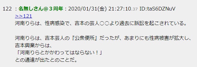 河南りらは、性病感染で、吉本の芸人○○より過去に訴訟を起こされている。